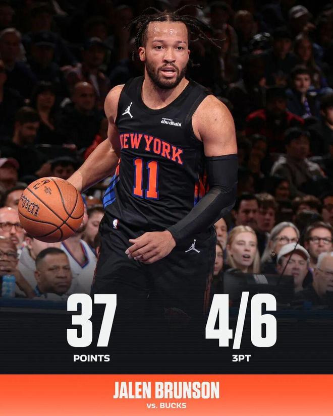 加盟尼克斯的第四年,布伦森正在打出生涯最强的表现,拿上一场击败雄鹿来说,布伦森再度闪耀:全场打了39分钟,投篮21中12,三分6中4,罚球10中9,拿下37分5助攻,正负值+10。