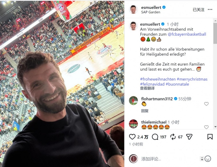 穆勒社媒晒出观赛照片,配文:“圣诞节前夕与朋友们一起观看拜仁男篮的比赛????????????????????各位都为圣诞夜做好准备了吗?好好享受与家人共度的美好时光,祝大家一切安好。”